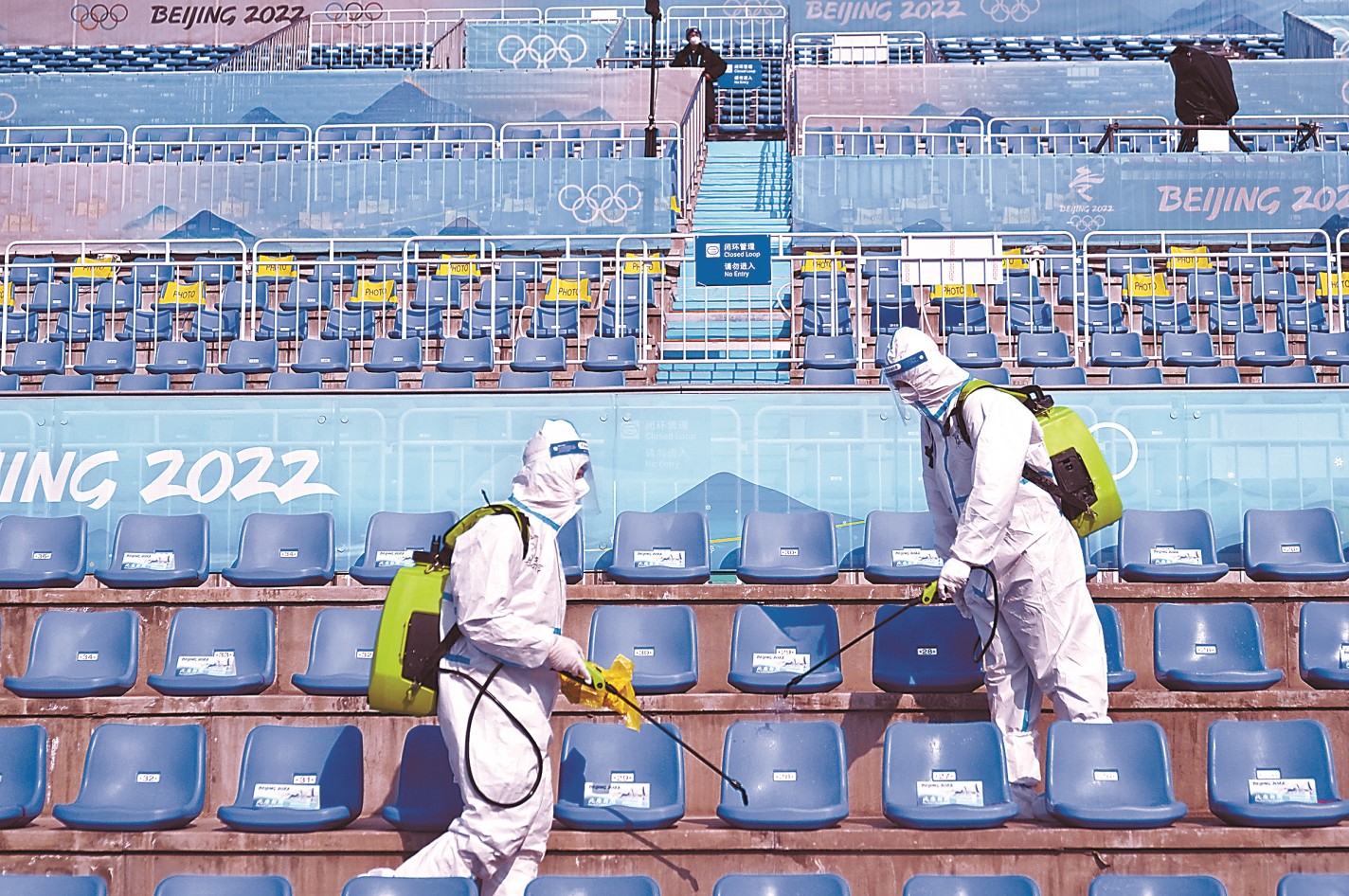 2月9日,自由式滑雪男子大跳台决赛后,工作人员对座椅进行消毒。
