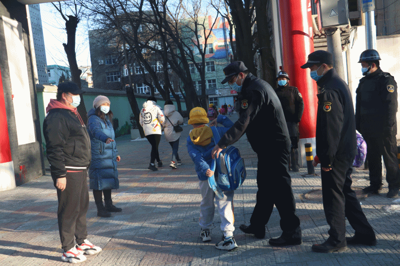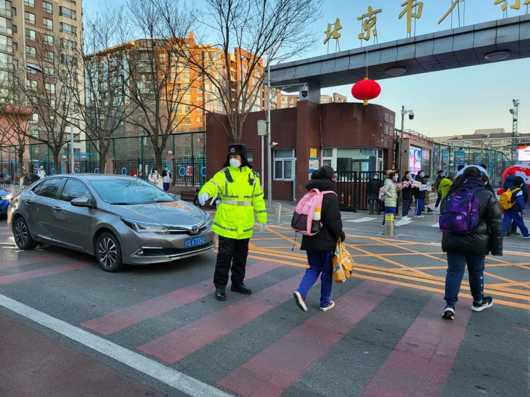 东城公安分局朝阳门派出所民警引导学生排队进入校园