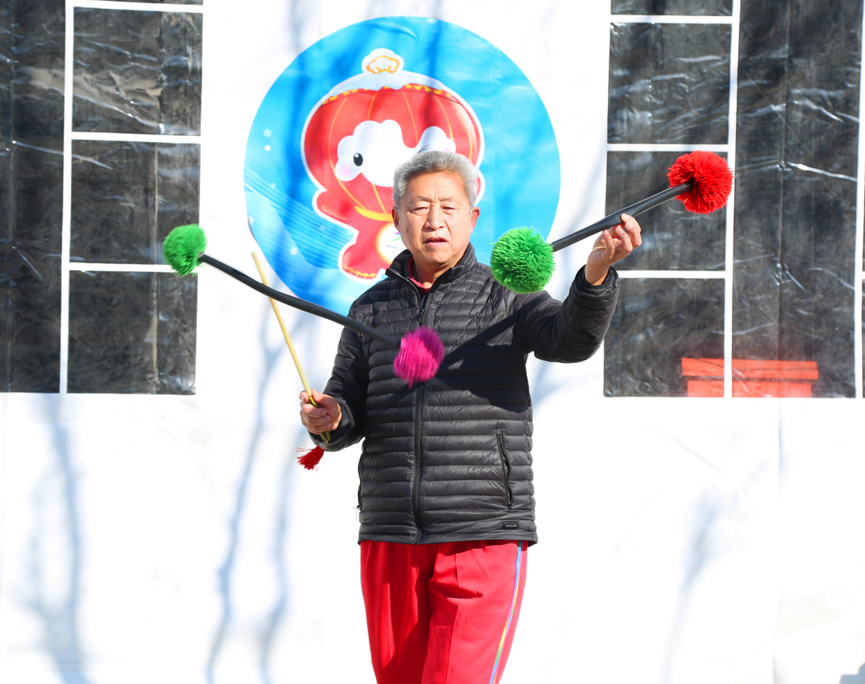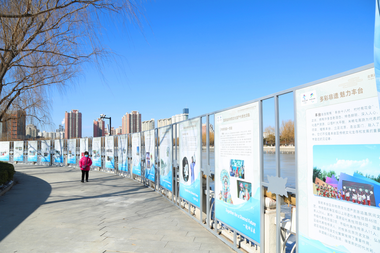 在中心舞台区左侧,21块冬奥主题知识展板整齐排列,上面不仅有2022年北京冬奥会15个运动分项和冬残奥会6个运动大项,还配有运动员比赛照片,以及与各种项目姿势相对应的冰墩墩照片,这些展板成为群众了解冬奥会和冬残奥会比赛项目的良好纽带。观演区的右侧是21块丰台区非物质文化遗产项目展板,涵盖民间文学、传统舞蹈、传统技艺、传统医药等区级以上非遗代表性项目,老百姓可以在观看演出之余很好地了解我们身边的非遗文化。广场内的几处空地还因地制宜设置了3处新春过大年的中国风打卡点,许多大朋友和小朋友们纷纷前去打卡拍照,拍出美美的新年照片。