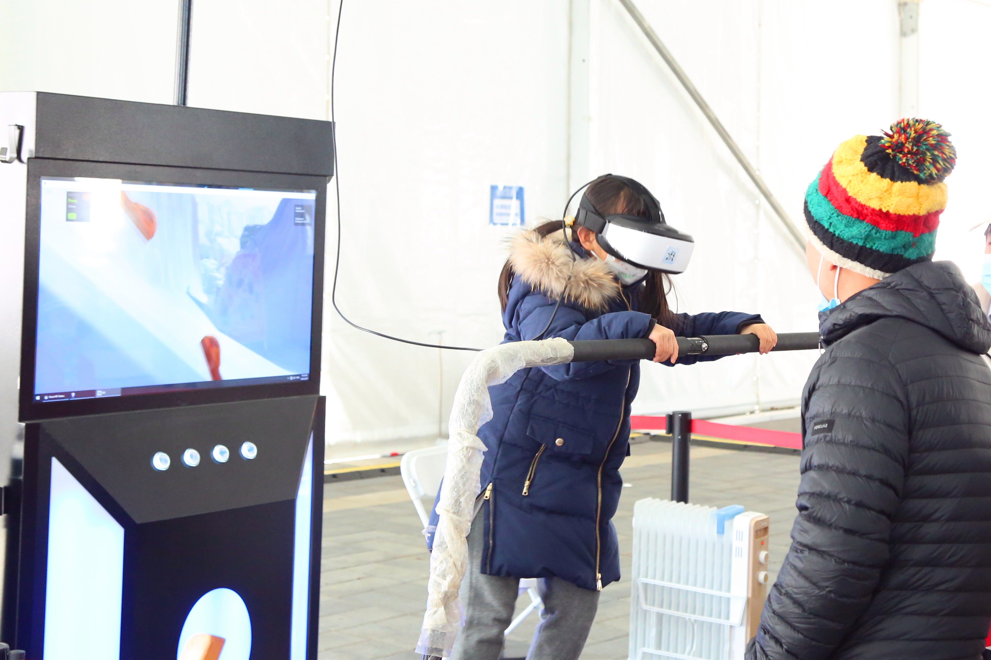 在冬奥文化广场的中心篷房内,旱地冰壶、桌上冰球、VR滑雪吸引了不少居民前来体验,很多小朋友被冰壶和冰球项目深深吸引,家长喊了好几次要回家吃午饭了还是依依不舍。此外,冬奥特许商品经营点位前也吸引了许多市民前来咨询订购。