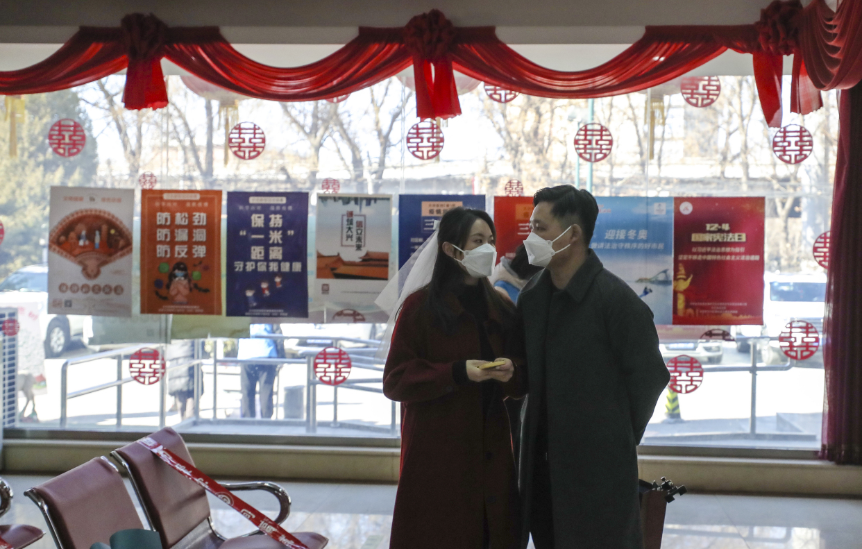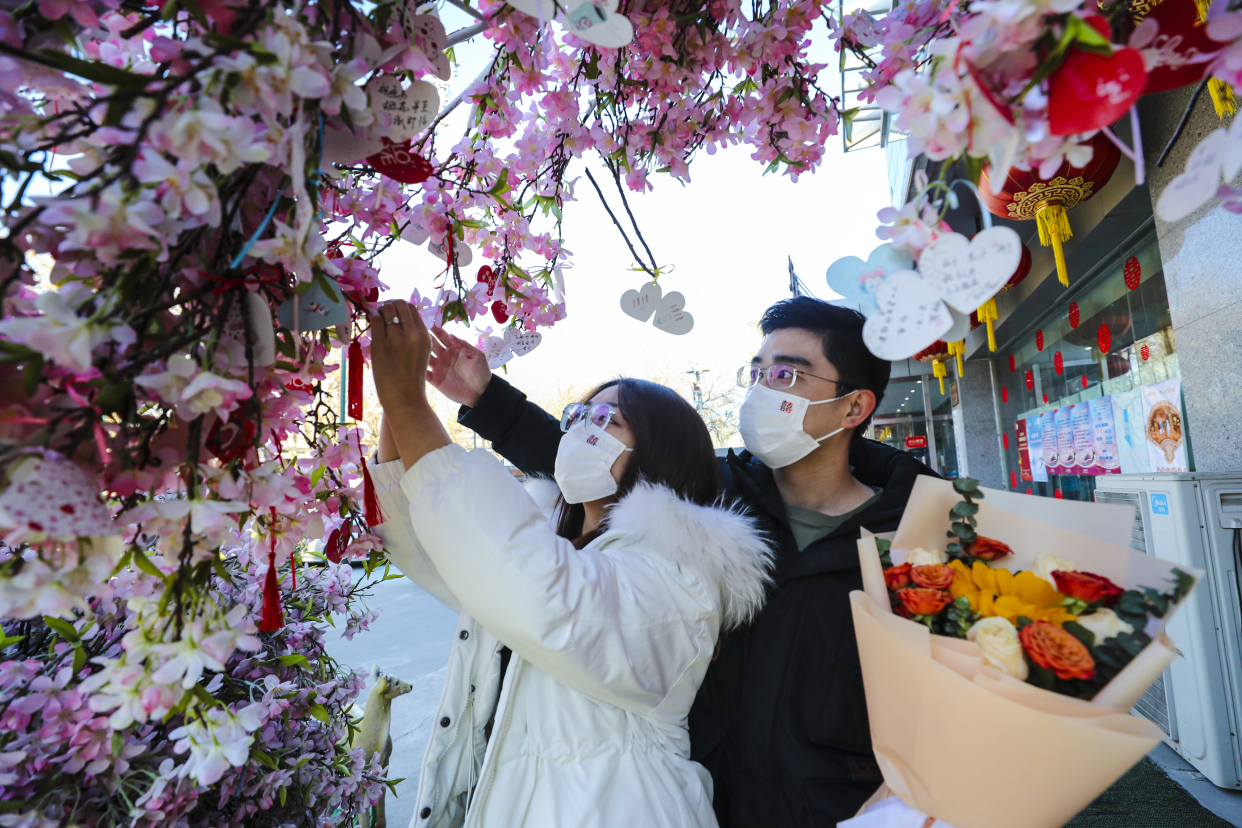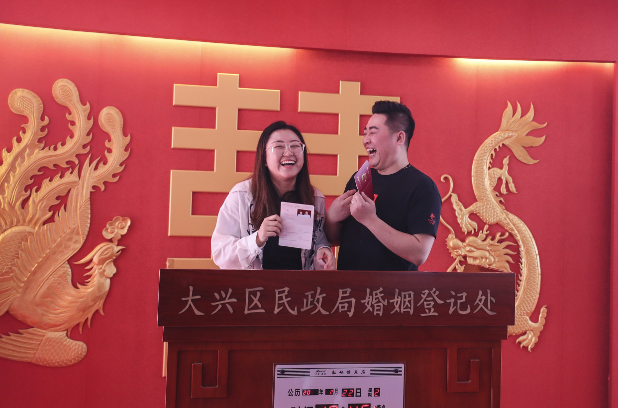 据大兴区婚姻登记中心主任李鑫介绍,2月22日的婚登预约数达到了311对,是平时的5倍多。为应对这次领证小高峰,大兴区婚姻登记中心特意增加了登记窗口、疫情防控人员和志愿者,提前一小时开门,并特别布置了现场,制造浪漫、甜蜜的氛围,希望平稳有序做好接待工作,让新人们感受到幸福。