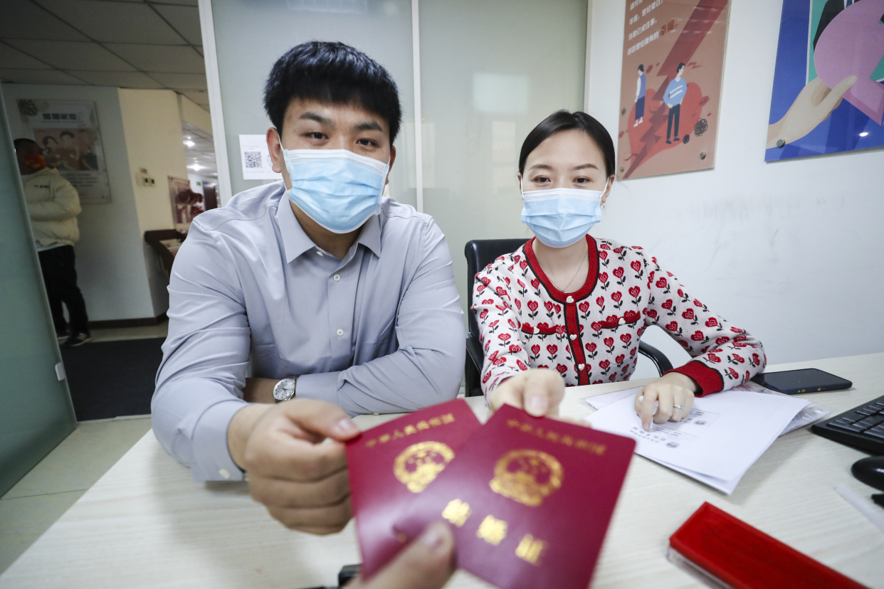 早上八点,记者在大兴区婚姻登记处看到,已有不少头戴婚纱、手捧鲜花的新人在排队,他们经过扫码、测温、签署疫情防控承诺书后,进入婚登大厅,按照婚登流程,领取心心念念的“小红本”。