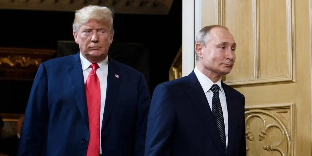 特朗普和普京于2018年7月会面时的照片,“商业内幕”报道配图