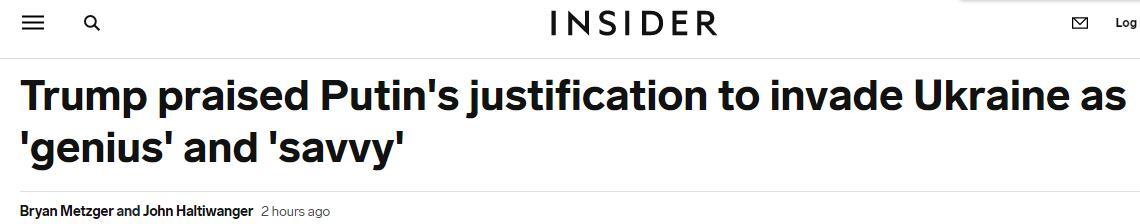 特朗普称,我昨天看着电视屏幕,“我说,‘这真是天才’。普京宣布乌克兰的很大一部分地区独立。哦,这真是太棒了。”当他被问到这条新闻时,特朗普还称:“我说,‘这得有多聪明啊?’他将派军去乌克兰,做和平卫士。”