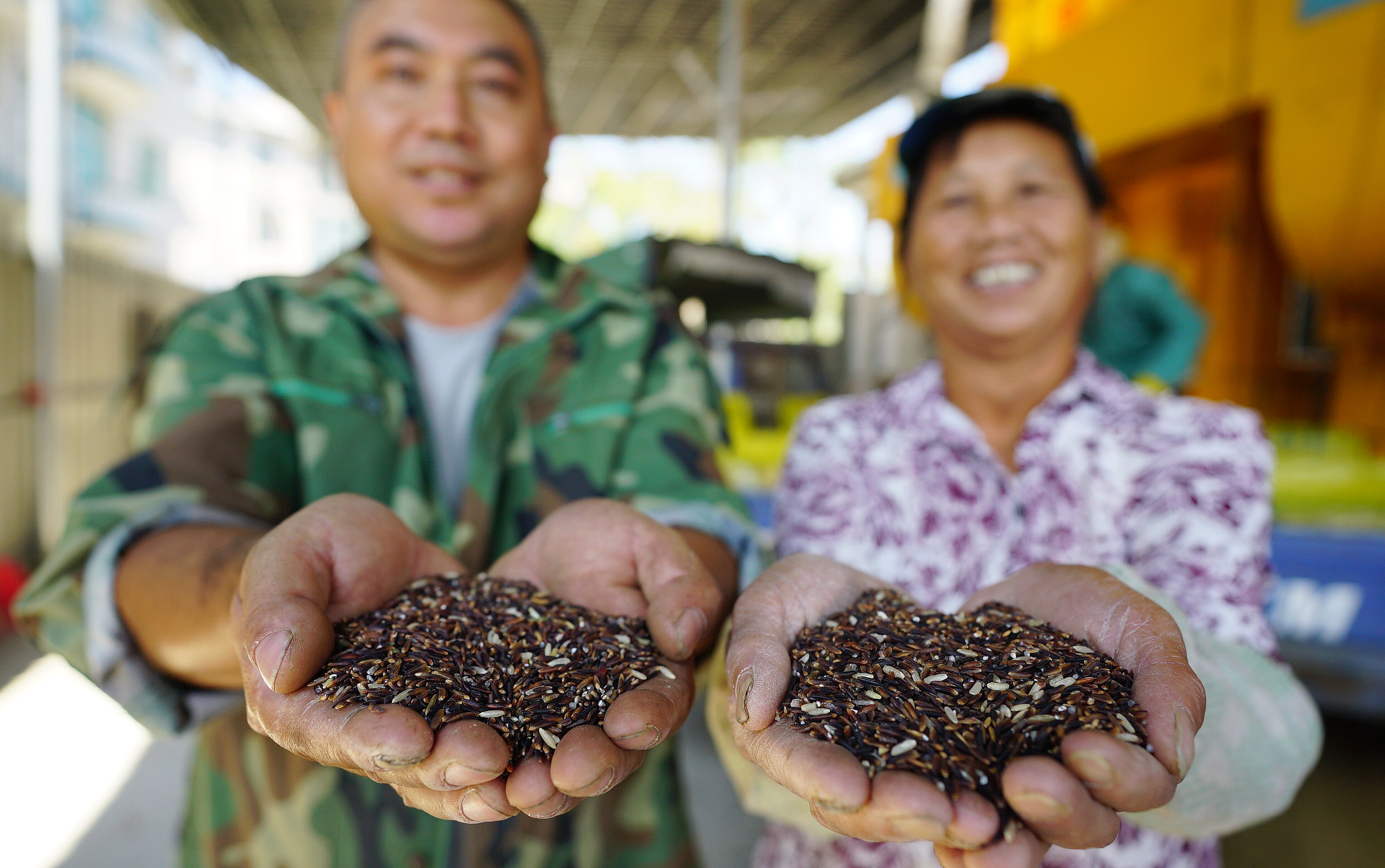 在位于江西省井冈山市龙市镇的井冈山市高山红米种植专业合作社,文龙才(左)和社员展示脱壳的井冈红米(2019年9月23日摄)。 新华社记者 彭昭之 摄