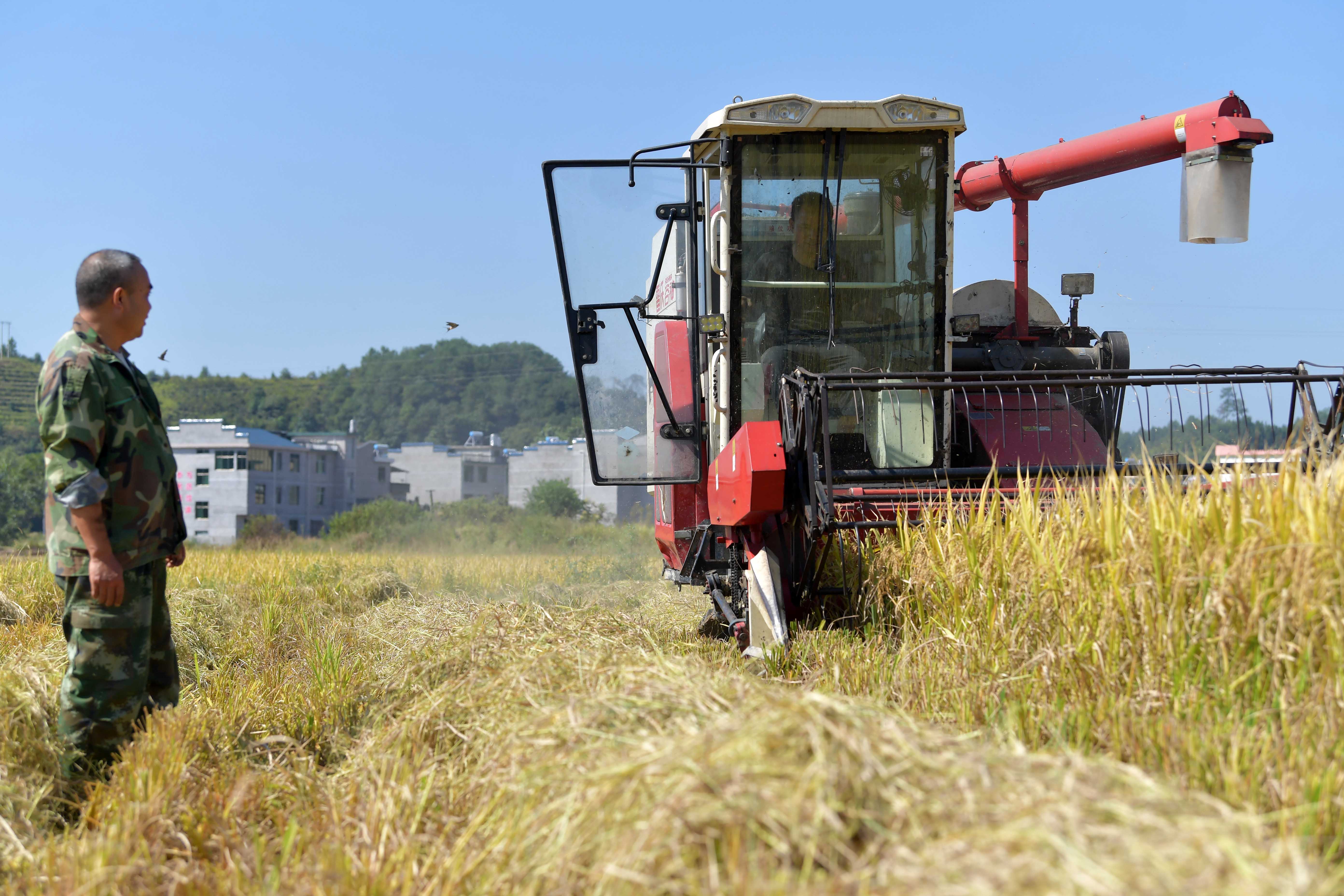 在江西省井冈山市龙市镇,井冈山市高山红米种植专业合作社社长文龙才(左)和社员在稻田里收割成熟的红米稻谷(2019年9月23日摄)。新华社记者 彭昭之 摄