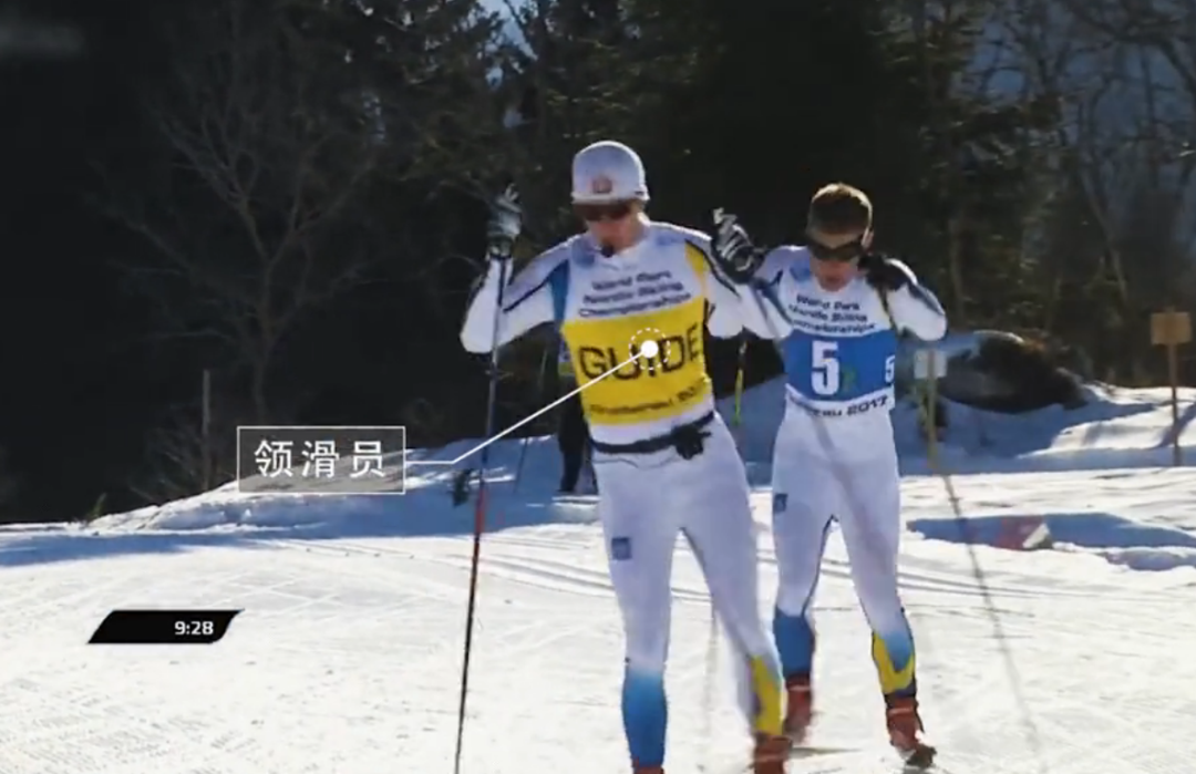 站姿运动员可根据其身体状况采用两个、单个或不使用雪杖进行比赛。全盲或几乎全盲运动员需要佩戴眼罩,由领滑员使用扬声器引导配合完成比赛,低视力运动员,可以选择比赛时是否使用领滑员。