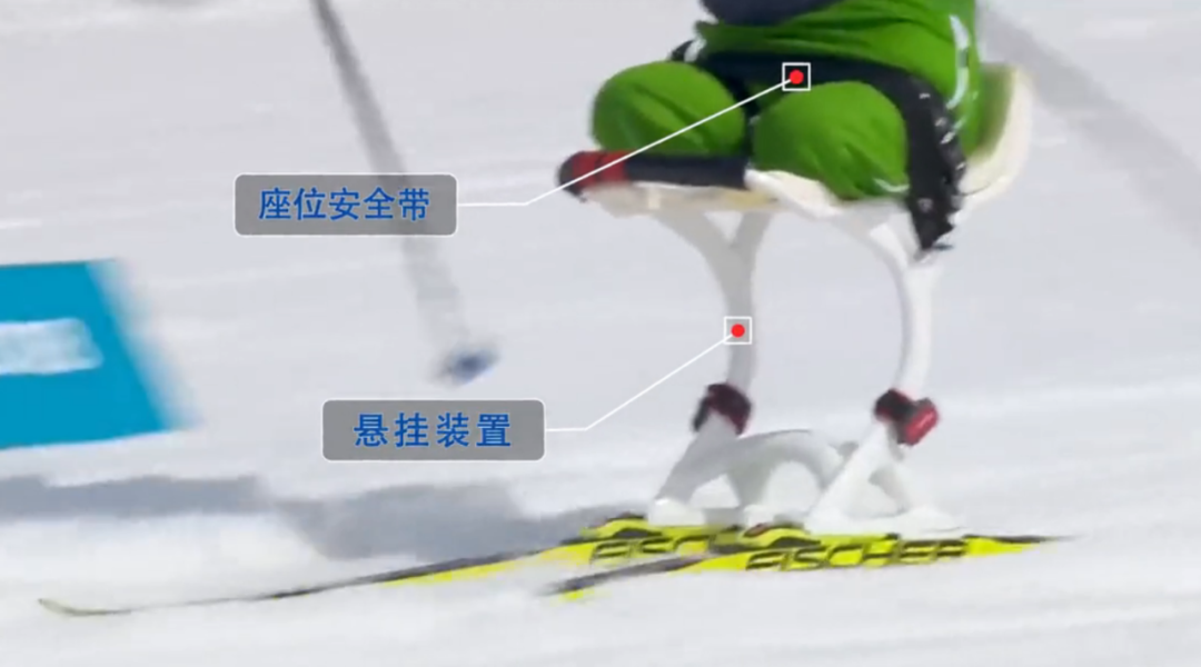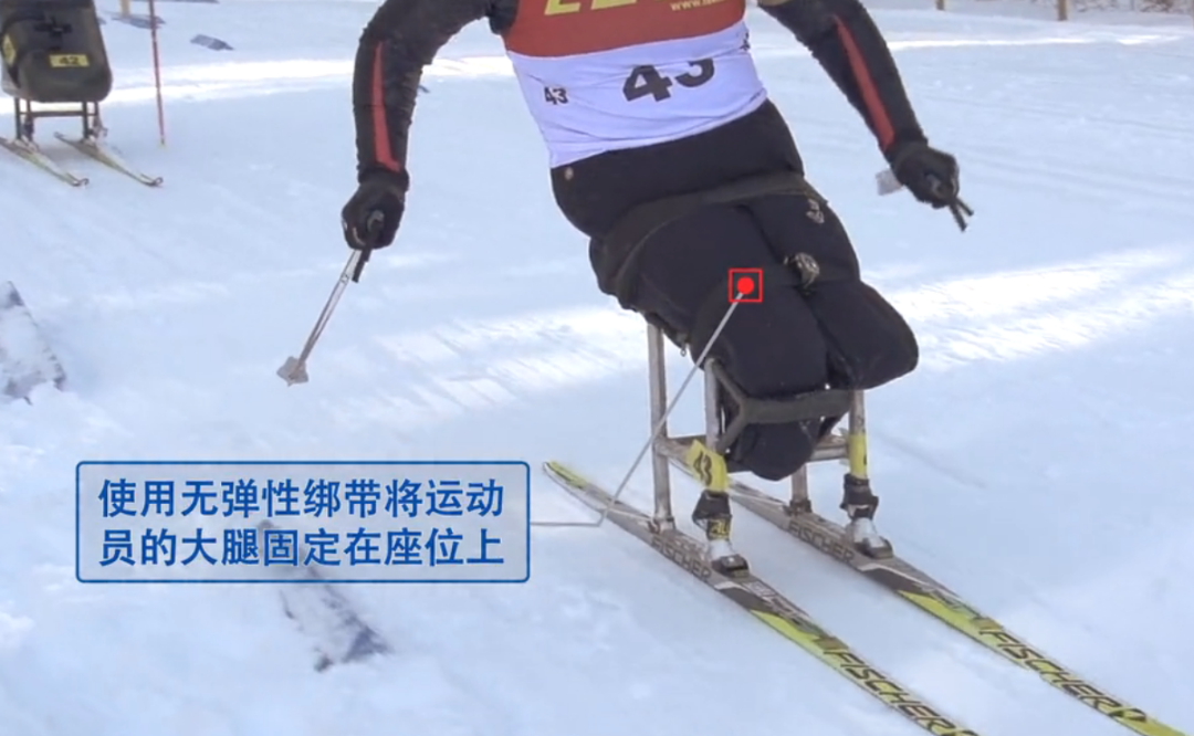 座位各连接处不能安装弹簧等弹性部件,座位与雪板连接处不可调节。必须使用无弹性绑带将运动员的大腿固定在座位上。