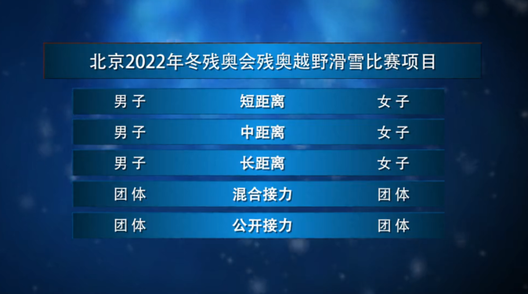 北京冬残奥会残奥越野滑雪比赛共设置 20 个小项,分为短距离、中距离、长距离3个个人项目和混合接力、公开接力。
