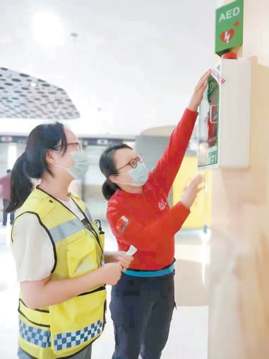 于秀丽母女检查AED是否工作正常。