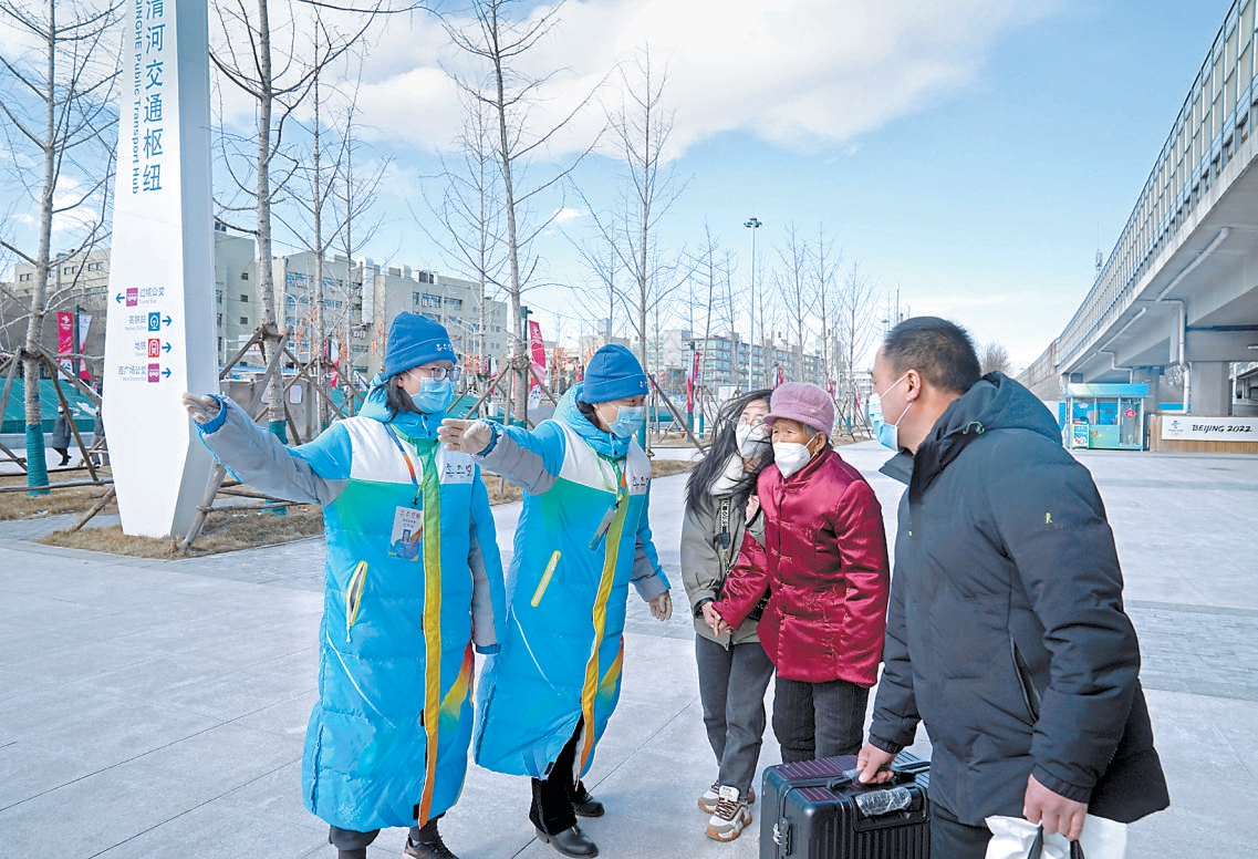 “乘出租车请往左边直走上台阶”“做核酸检测在我们服务站右后方”“去东广场从左侧穿过地下通道就是了”……在京张高铁清河站西广场正中央的志愿服务站前,身着蓝色服装的志愿者们热情地为南来北往的乘客指引方向。