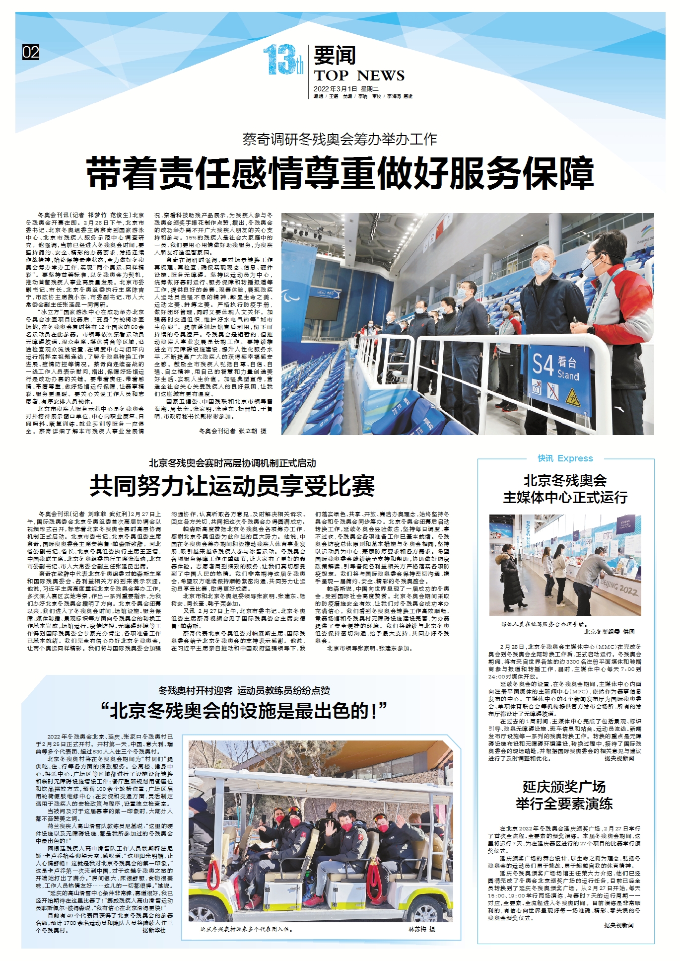 蔡奇在调研时强调,要对场景转换工作再梳理、再检查,确保实现观念、信息、硬件设施、服务无障碍。坚持以运动员为中心,统筹做好赛时运行、服务保障和转播报道等工作,提供良好的参赛、观赛体验,展现残疾人运动员自强不息的精神,彰显生命之美、运动之美、拼搏之美。严格执行防疫手册,做好闭环管理,同时又要体现人文关怀。加强赛时交通组织,维护好水电气热等“城市生命线”。提前谋划场馆赛后利用,留下可持续的冬奥遗产。冬残奥会是短暂的,但推动残疾人事业发展是长期工作。要持续推进全市无障碍设施建设,提升人性化服务水平,不断提高广大残疾人的获得感幸福感安全感。鼓励全市残疾人弘扬自尊、自信、自强、自立精神,用自己的智慧和力量创造美好生活、实现人生价值。加强典型宣传,营造全社会关心关爱残疾人的良好氛围,让我们这座城市更有温度。