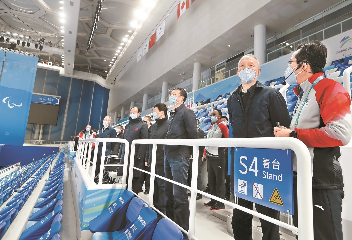 “冰立方”国家游泳中心在成功举办北京冬奥会冰壶项目比赛后,“变身”为轮椅冰壶场地,在冬残奥会赛时将有12个国家的60余名运动员在此参赛。市领导依次察看运动员无障碍坡道、观众坐席、媒体看台等区域,沿途检查观众流线设置,在调度中心与闭环内运行指挥室视频连线,了解冬残奥转换工作进展、疫情防控等情况。蔡奇向连续奋战的一线工作人员表示慰问,指出,保障好场馆运行是成功办赛的关键。要带着责任、带着感情、带着尊重,做好场馆运行保障,让赛事精彩、服务更温暖。要关心关爱工作人员和志愿者,有序安排人员轮休。