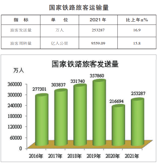 旅客运输。国家铁路旅客发送量完成25.33亿人,比上年增加3.66亿人,增长16.9%;国家铁路旅客周转量完成9559.09亿人公里,比上年增加1300.99亿人公里,增长15.8%。