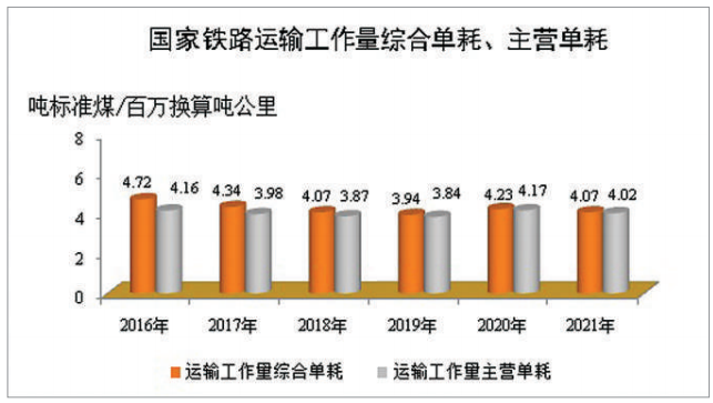 综合能耗。国家铁路能源消耗折算标准煤1580.74万吨,比上年增加85.86万吨,增长5.7%。单位运输工作量综合能耗4.07吨标准煤/百万换算吨公里,比上年减少0.16吨标准煤/百万换算吨公里,下降3.9%。单位运输工作量主营综合能耗4.02吨标准煤/百万换算吨公里,比上年减少0.15吨标准煤/百万换算吨公里,下降3.5%。