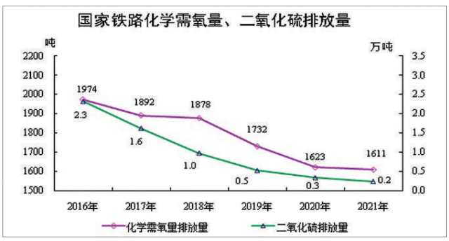 主要污染物排放量。国家铁路化学需氧量排放量1611吨,比上年降低0.7%。二氧化硫排放量0.2万吨,比上年降低29.0%。