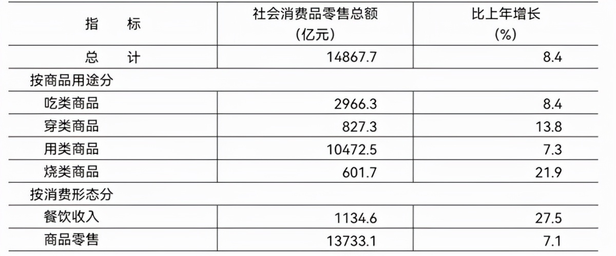 全年市场总消费额比上年增长11.0%。其中,服务性消费额增长13.4%;实现社会消费品零售总额14867.7亿元,增长8.4%。限额以上批发和零售业中,与升级类消费相关的金银珠宝类、文化办公用品类、通讯器材类商品零售额分别增长33.1%、21.4%和16.7%。