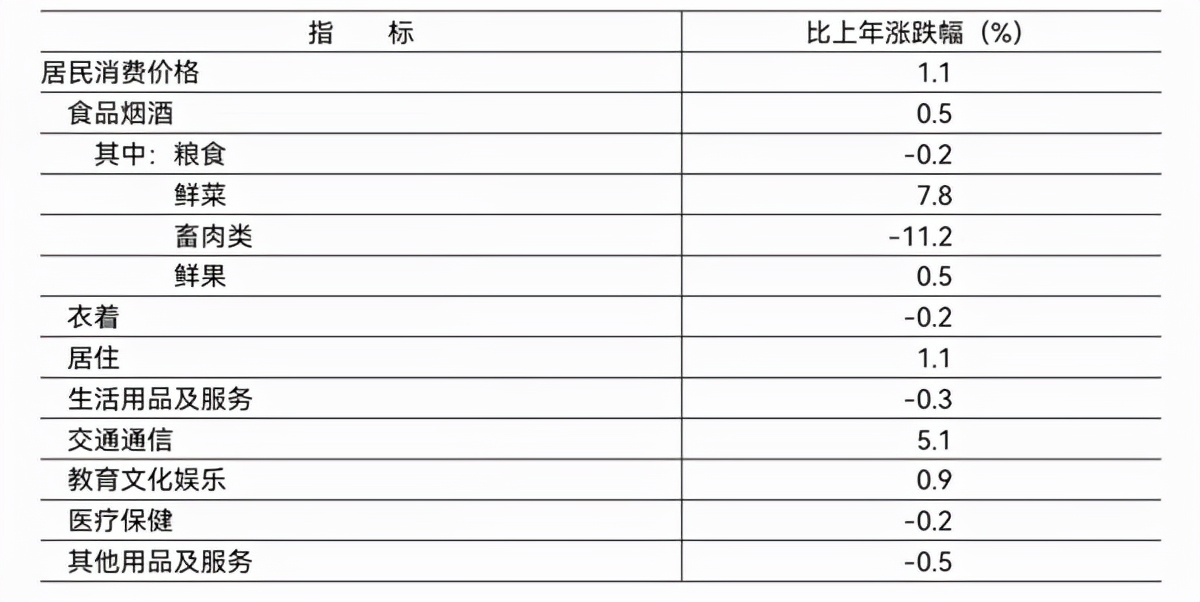 价格:全年居民消费价格总水平比上年上涨1.1%。工业生产者出厂价格比上年上涨1.1%,工业生产者购进价格上涨3.7%。农产品生产者价格比上年下降1.8%。全年新建商品住宅价格较为平稳,二手住宅价格呈小幅波动态势。12月份,新建商品住宅销售价格环比指数为100.0、同比指数为105.1;二手住宅销售价格环比指数为100.8、同比指数为108.5。