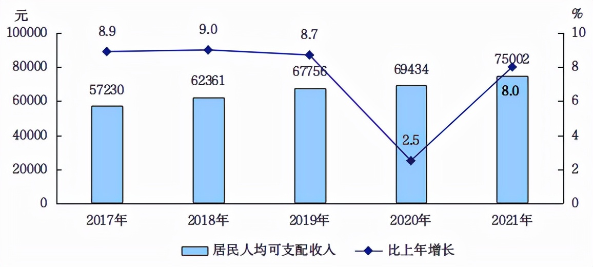 人民生活:全年全市居民人均可支配收入为75002元,比上年增长8.0%,其中:城镇居民人均可支配收入为81518元,增长7.8%,农村居民人均可支配收入为33303元,增长10.5%。从四项收入构成看,全市居民人均工资性收入45675元,增长10.2%;人均经营净收入940元,增长15.8%;人均财产净收入12460元,增长5.7%;人均转移净收入15927元,增长3.5%。
