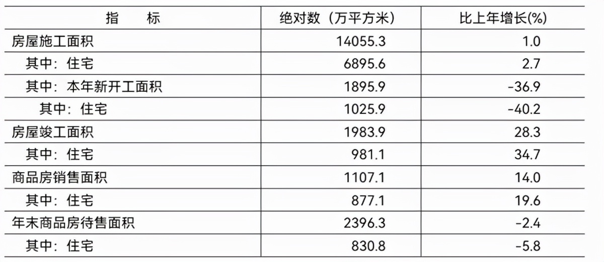 房地产开发:全年房地产开发投资比上年增长5.1%。其中,住宅投资增长8.9%,办公楼投资下降7.6%,商业营业用房投资下降13.7%。全市房屋施工面积14055.3万平方米,比上年增长1.0%。其中,本年新开工面积1895.9万平方米,下降36.9%。全年房屋竣工面积1983.9万平方米,增长28.3%。