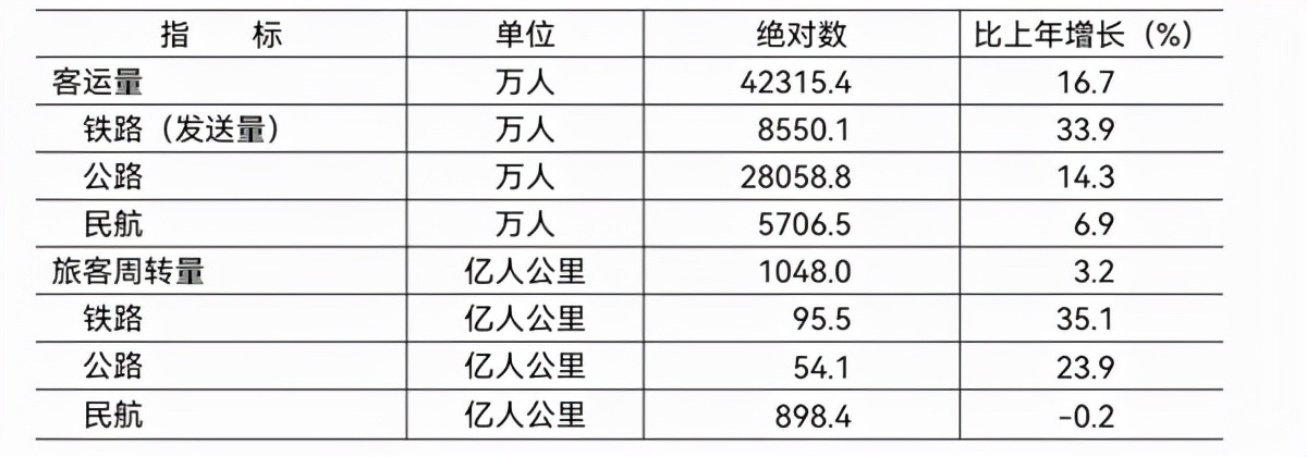 交通运输:全年货运量28132.3万吨,比上年增长6.8%;货物周转量881.1亿吨公里,增长4.5%。全年客运量42315.4万人,增长16.7%;旅客周转量1048.0亿人公里,增长3.2%。