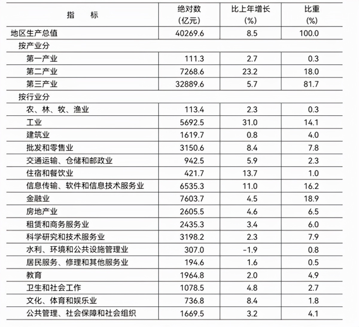 经济增长:初步核算,全年实现地区生产总值40269.6亿元,按不变价格计算,比上年增长8.5%。其中,第一产业增加值111.3亿元,增长2.7%;第二产业增加值7268.6亿元,增长23.2%;第三产业增加值32889.6亿元,增长5.7%。三次产业构成为0.3:18.0:81.7。按常住人口计算,全市人均地区生产总值为18.4万元。