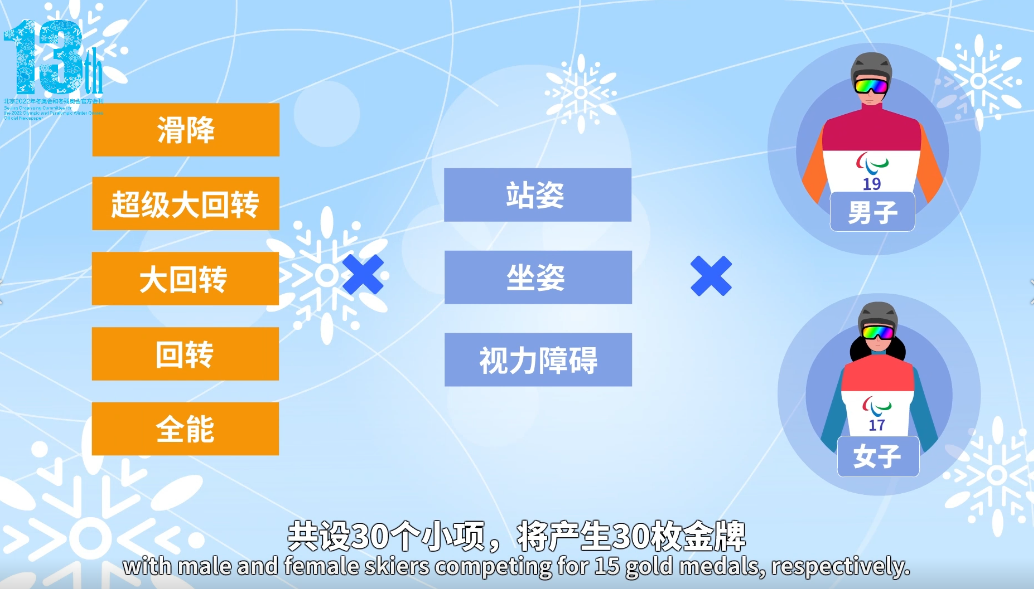 冬残奥会残奥高山滑雪分项共有5个,分别是:滑降、超级大回转、大回转、回转和全能,每个分项都分为站姿、坐姿和视障3种类别,男子、女子项目设置相同,共计30个小项。