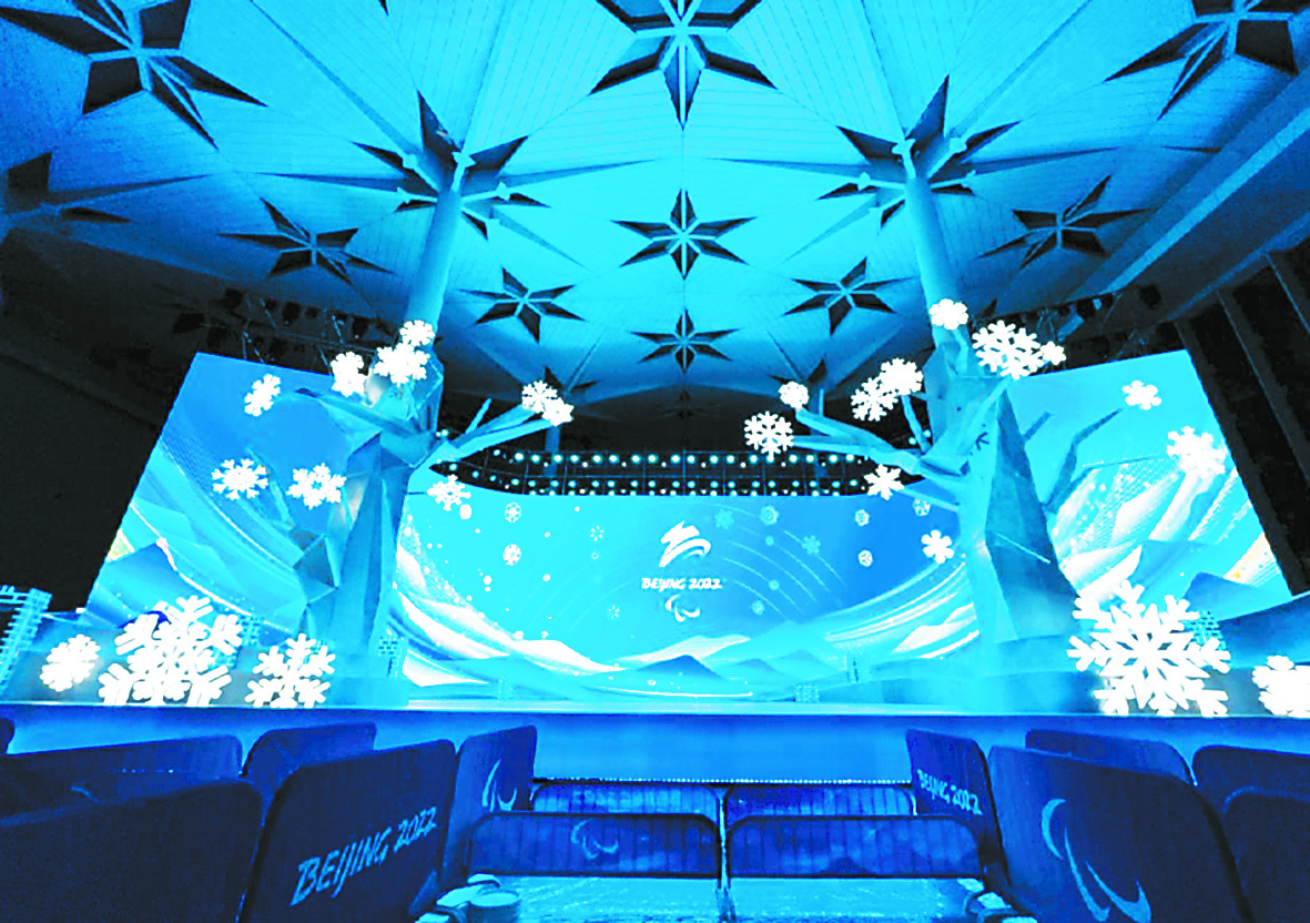 延庆冬残奥颁奖广场运行团队属地关系副主任赖慧武介绍,国际馆顶棚每一朵雪花,都集雨水收集、光伏、采光、遮阳等众多绿色技术于一体,体现绿色发展、节俭办奥和会后可持续利用的理念。