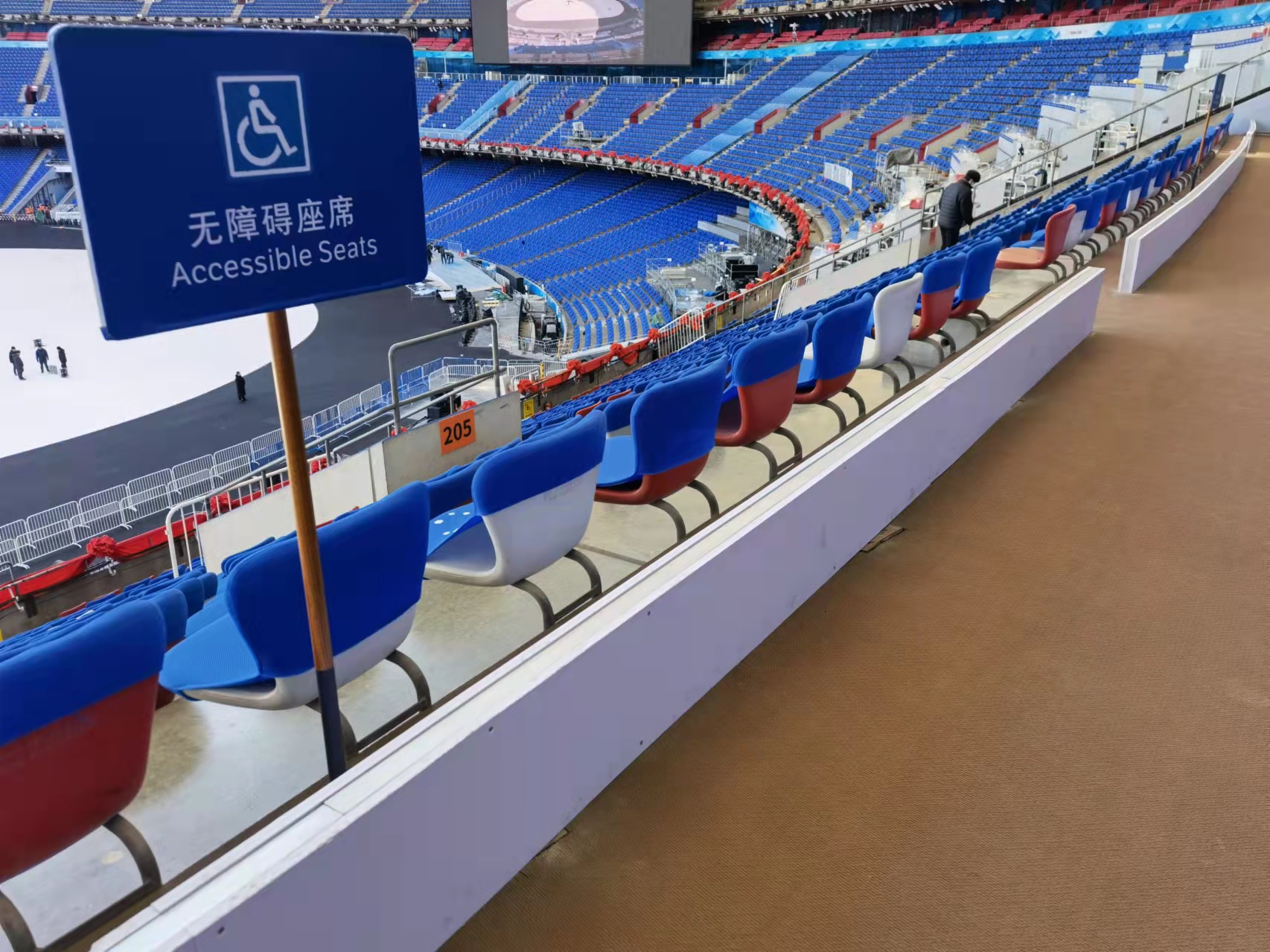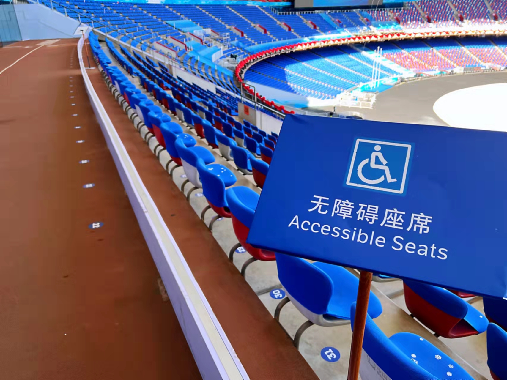 观众座席区,“鸟巢”贴心设置了144个无障碍座席和1:1比例陪护席位,并在座位前方设置10厘米高的挡台,确保观演安全。