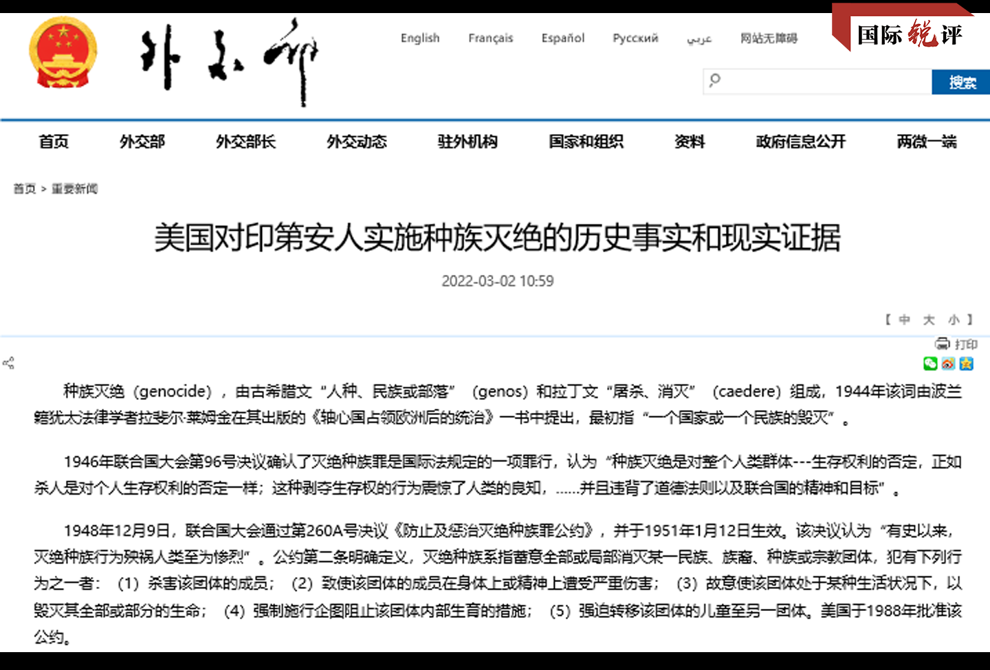 长期以来,美国以“人权教师爷”自居,动辄对他国内政和人权状况横加干涉,却对自身人权劣迹极力掩饰,遭到国际社会广泛批评。多国通过联合国人权理事会等场合,强烈谴责美国对印第安人实施种族灭绝以及当前对印第安人权利的侵犯,敦促其认真反思并纠正错误。