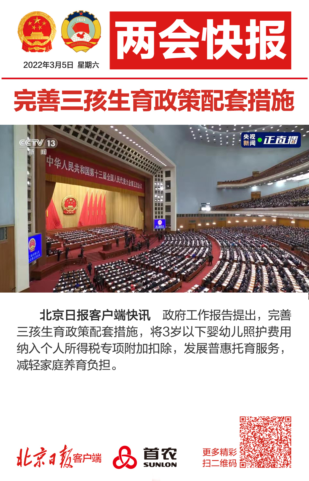 政府工作报告说,完善三孩生育政策配套措施,将3岁以下婴幼儿照护费用纳入个人所得税专项附加扣除,发展普惠托育服务,减轻家庭养育负担。