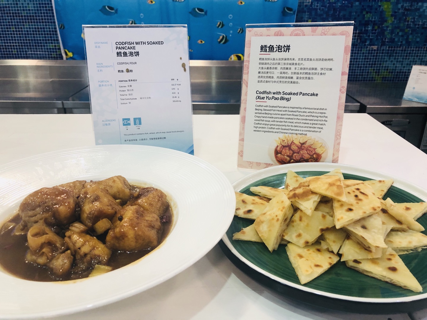 鳕鱼泡饼从鱼头泡饼演绎而来。大鱼头酱香浓郁、肉质嫩滑,手工烙饼外皮酥脆、饼芯软嫩,蘸汤后更可口,一菜两吃。创新版本的鳕鱼泡饼考虑到外宾饮食习惯,主食材选用西餐常用食材鳕鱼,优质鳕鱼肉质鲜美细嫩,富含优质蛋白,是西式食材与中式烹饪的完美融合。