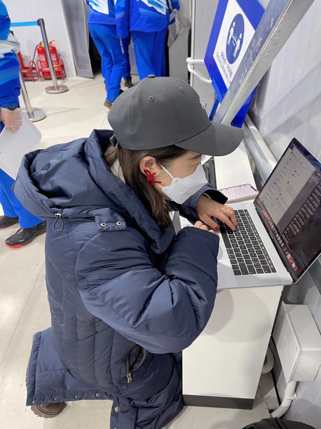 视频直播编辑部柳爽在冬奥会北京颁奖广场混采间撰写稿件