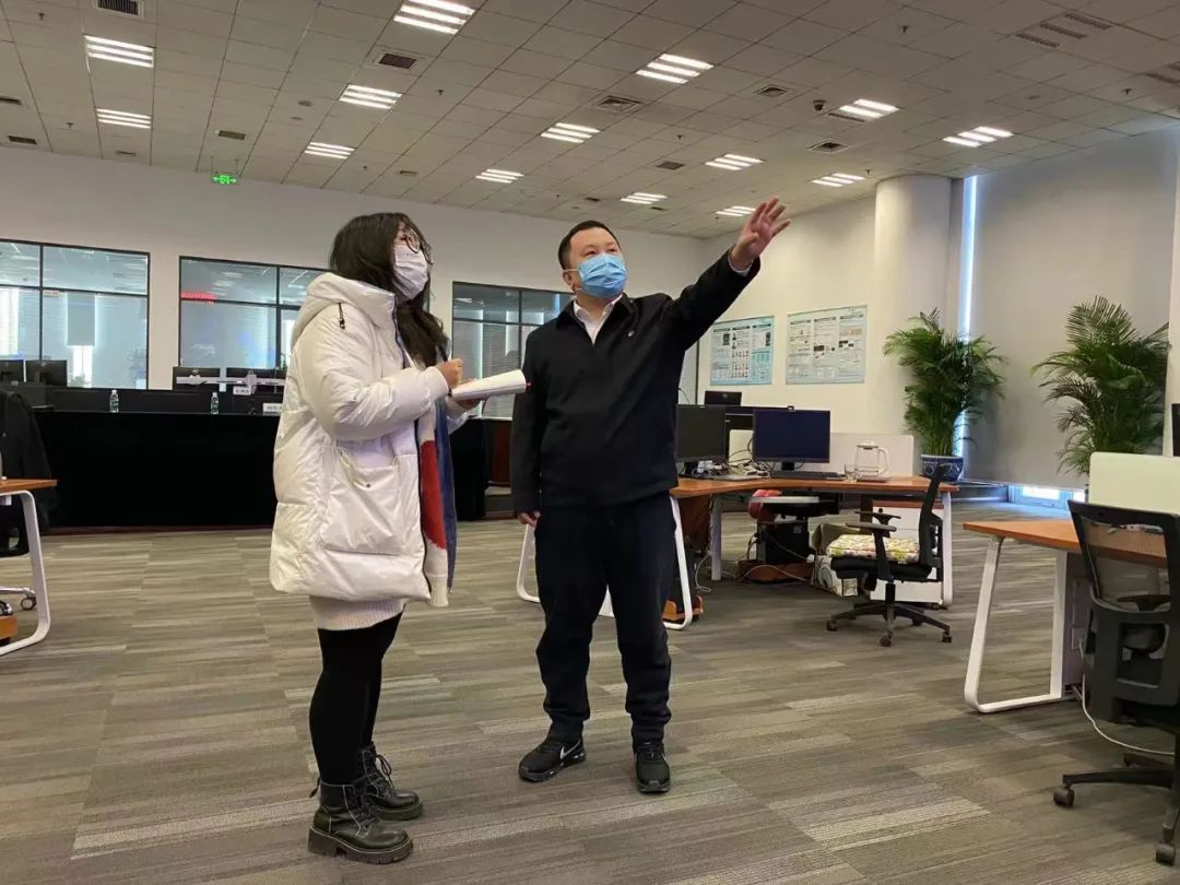 除夕上午,经济新闻部赵语涵(左)在位于未来科学城的国网智能电网研究院采访冬奥供电网络保障