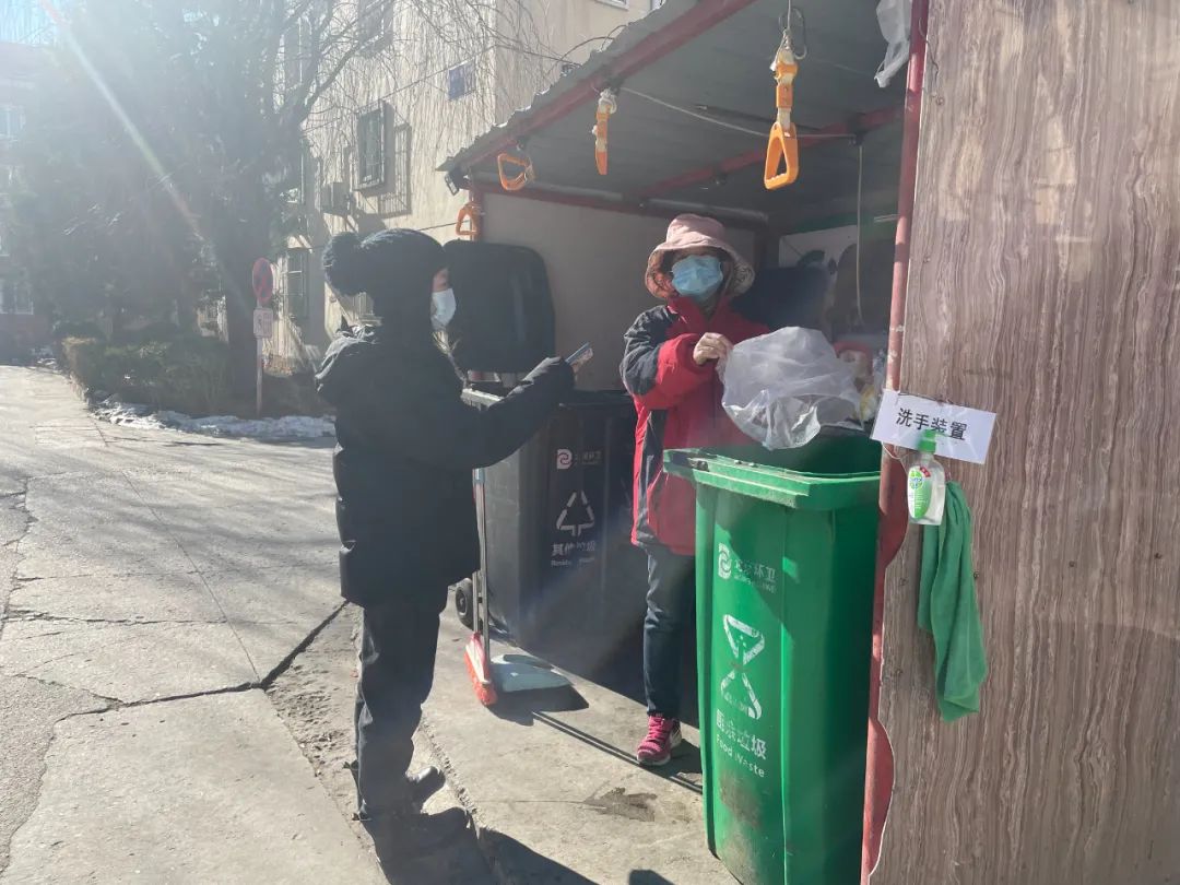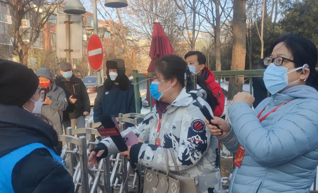 2022年除夕下午,地区新闻部孙颖(右一)在海淀区马连洼百旺茉莉园一期解封现场采访