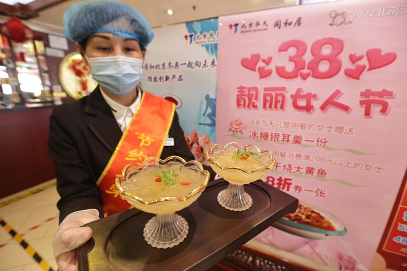 在同和居月坛店,几乎每张餐桌上都摆着几份碗口带有金色花边的高脚玻璃碗,用来盛熬制得软糯香甜的银耳羹。这是为了庆祝三八妇女节,同和居5家门店师傅们特意为当天到店用餐的女士赠送的福利。
