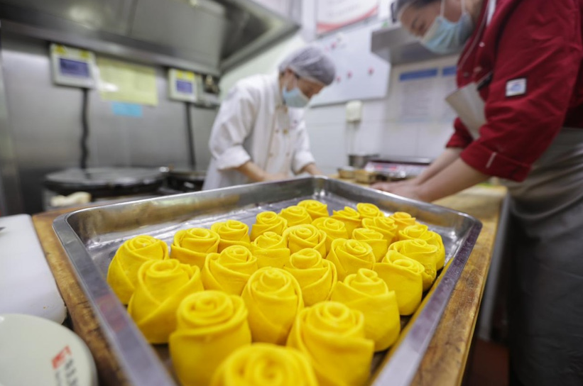 在华天二友居西黄城根店,两位面点师傅正在用蒸熟的南瓜和面粉制作面艺玫瑰花,外形逼真,色彩鲜艳,给女性节日添了一抹亮色。