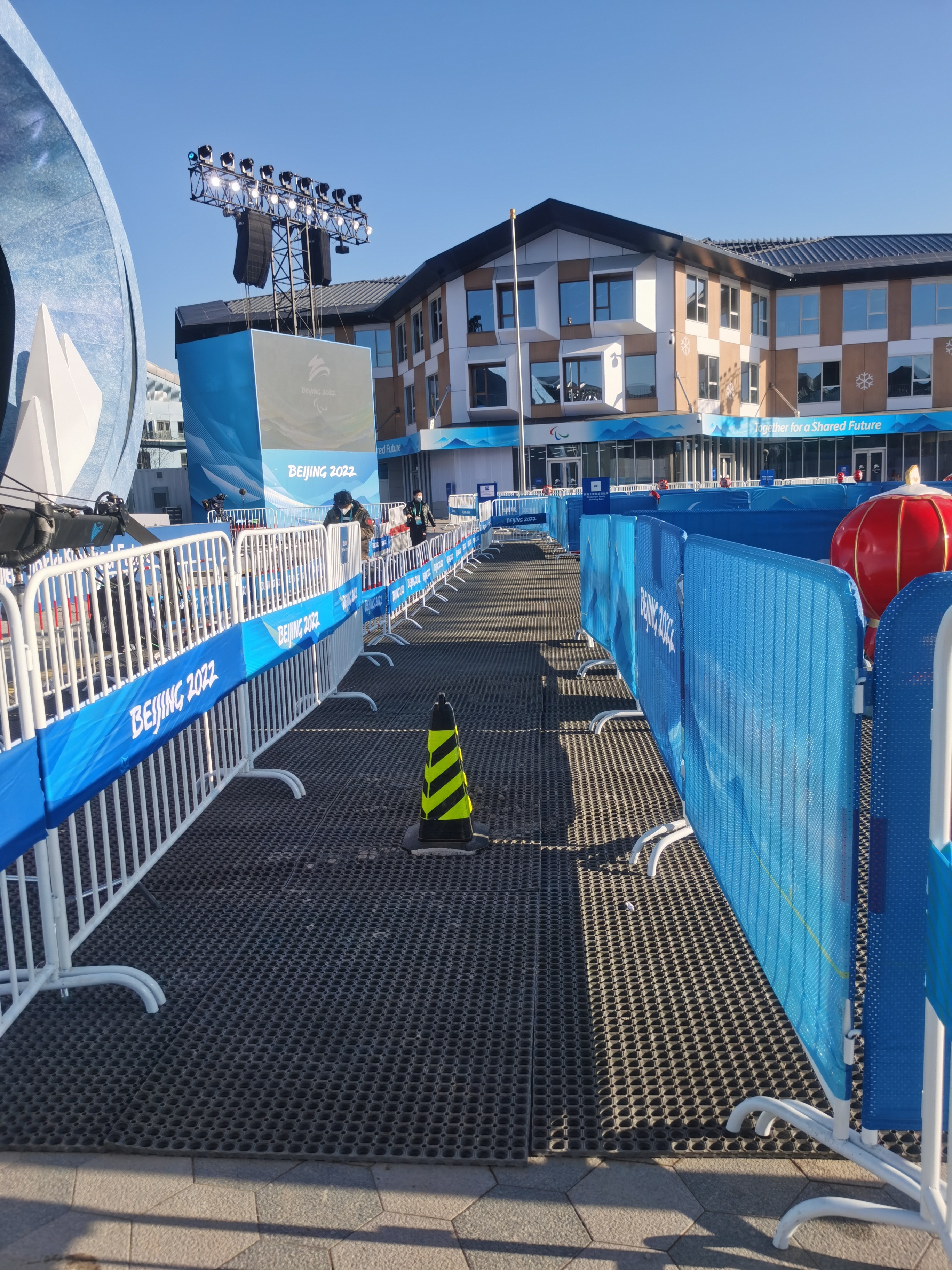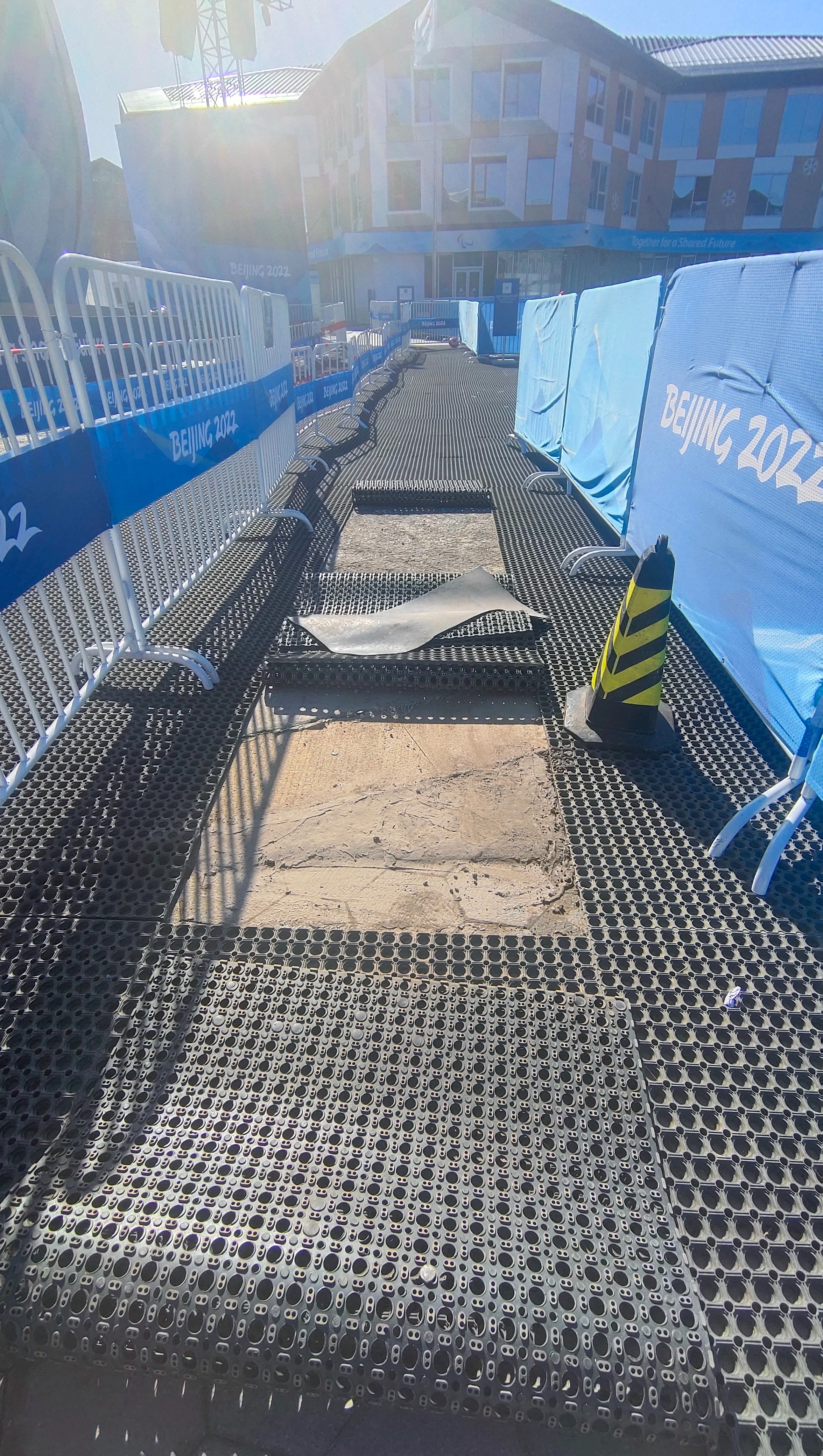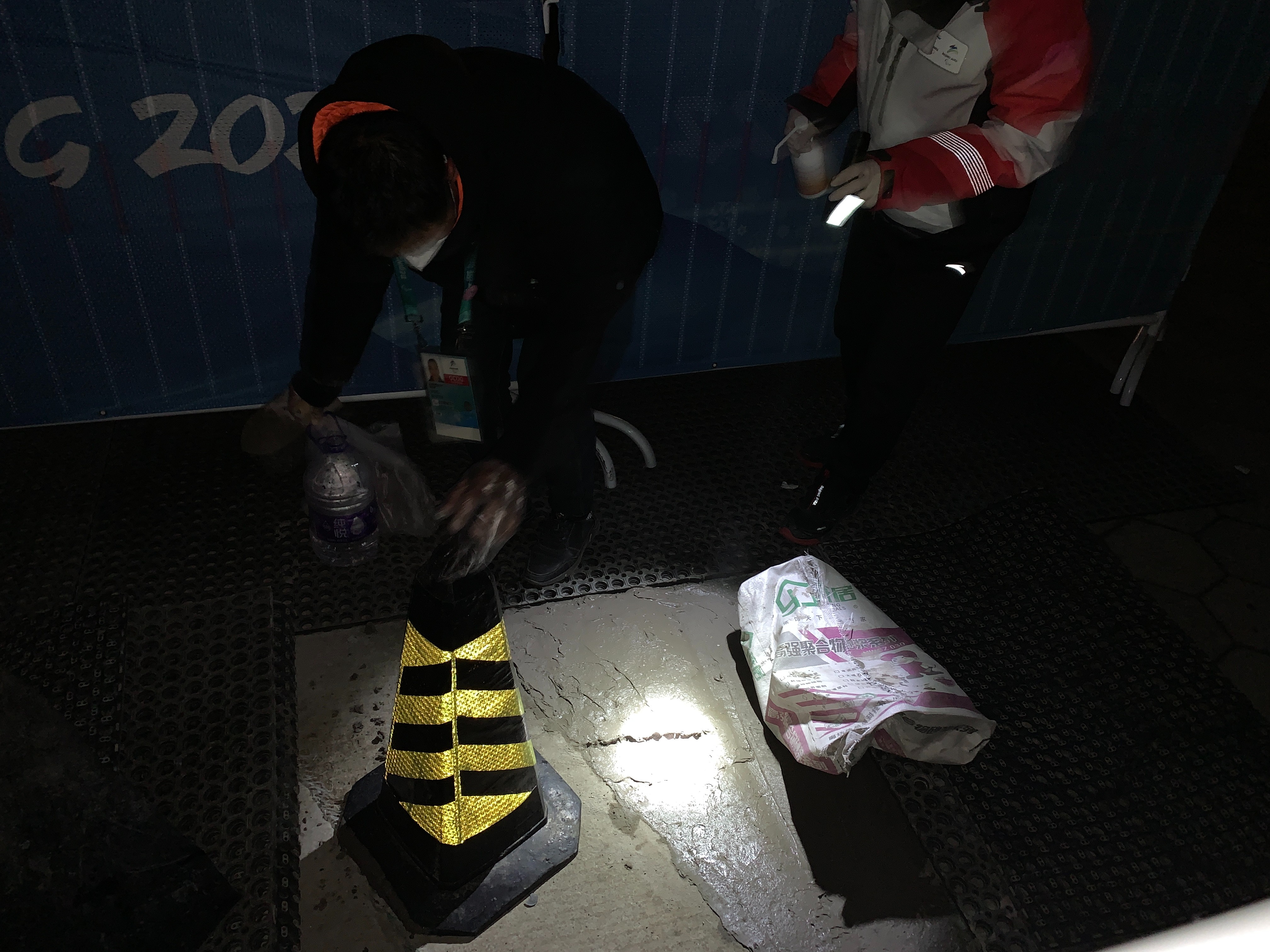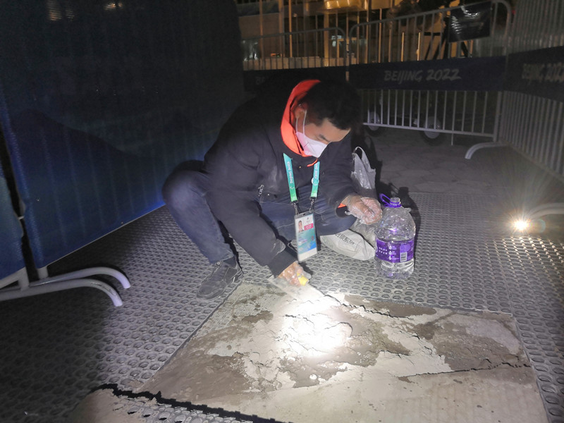 但水泥施工后需要一段时间才可通行,崇礼气温较低,耗时就更长。基础设施领域闭环内工作人员于7日晚21:00场馆运行结束后抓紧施工,他们用手电筒照明,现场调制水泥,找到合理坡面角度,完成施工,并用铁马围住临时关闭通道,留出充分的时间晾干,保障次日晚上的顺利运行。