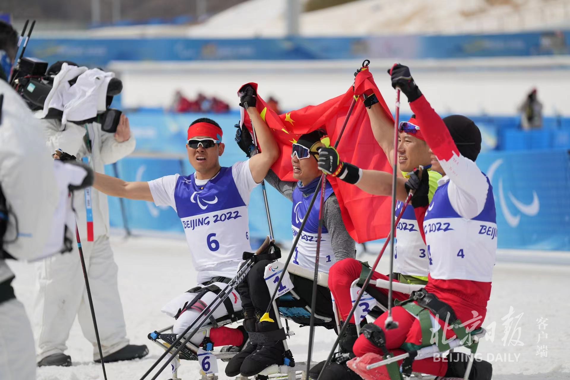 第九金!北京运动员郑鹏为中国队再入一金。北京冬残奥会残奥越野滑雪男子短距离自由技术(坐姿组)比赛刚刚结束,中国选手郑鹏2分42秒04夺金,毛忠武获得银牌,加拿大选手卡梅隆获得第三名。