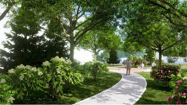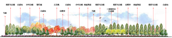 位于京藏高速西侧,北侧临近居住区及科研教育用地,用地约0.76万平方米。设计中保留临时绿化树木,在植物上优先选择乡土树种,点缀多种色叶树,如银红槭、银杏、五角枫等植物。同时,将种植海棠、山桃等观花乔木和鸢尾、山桃草、马蔺等观花地被。未来,这里将呈现林叶与缤纷花草组成的优美丰富景观。