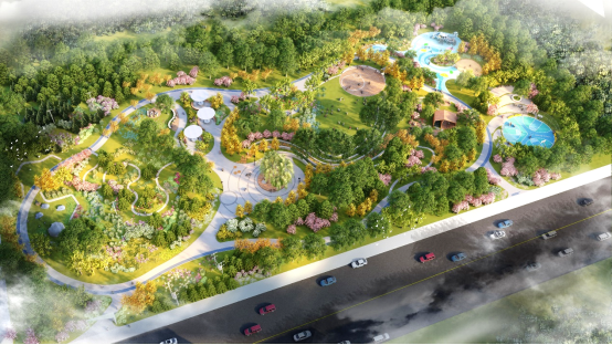 位于万科天空之城西侧,用地约0.19万平方米。在设计中加入蜿蜒的林下步行道,为居民提供舒适、安全的通行空间。与天空之城广场衔接的区域设置休息场地,并考虑游人的通行使用需求,预留出入口。