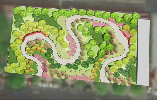 位于北京人家东侧,西、北、南三面均为现状实体围墙,其中北侧为汽配城批发市场,东侧紧邻京藏高速辅路,用地约0.22万平方米。这里是北京人家东侧人行出入口与京藏辅路连通的区域,设计时综合考虑绿化及通行功能,中心绿道以山桃搭配丛生元宝枫形成春赏花、秋观叶的季节景观,围墙整体进行立面处理并种植爬山虎,同时增设弧形坐凳、种植遮荫树木,为居民提供林荫休憩空间。