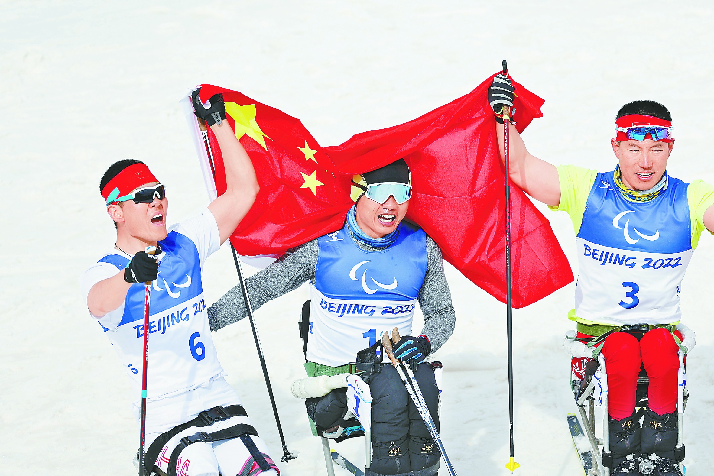 残奥越野滑雪男子短距离-坐姿决赛,郑鹏(中)夺冠,毛忠武(右)获得银牌。郑鹏也因此成为第一个在冬残奥会上获得两枚金牌的中国运动员。 视觉中国 供图