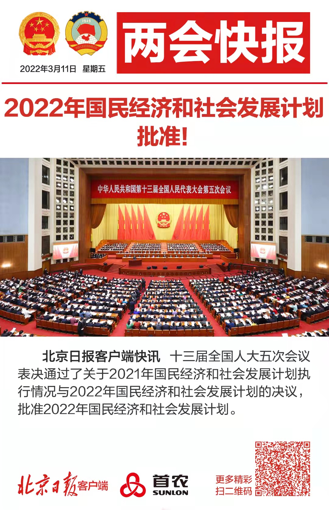 十三届全国人大五次会议表决通过了关于2021年国民经济和社会发展计划执行情况与2022年国民经济和社会发展计划的决议,批准2022年国民经济和社会发展计划。