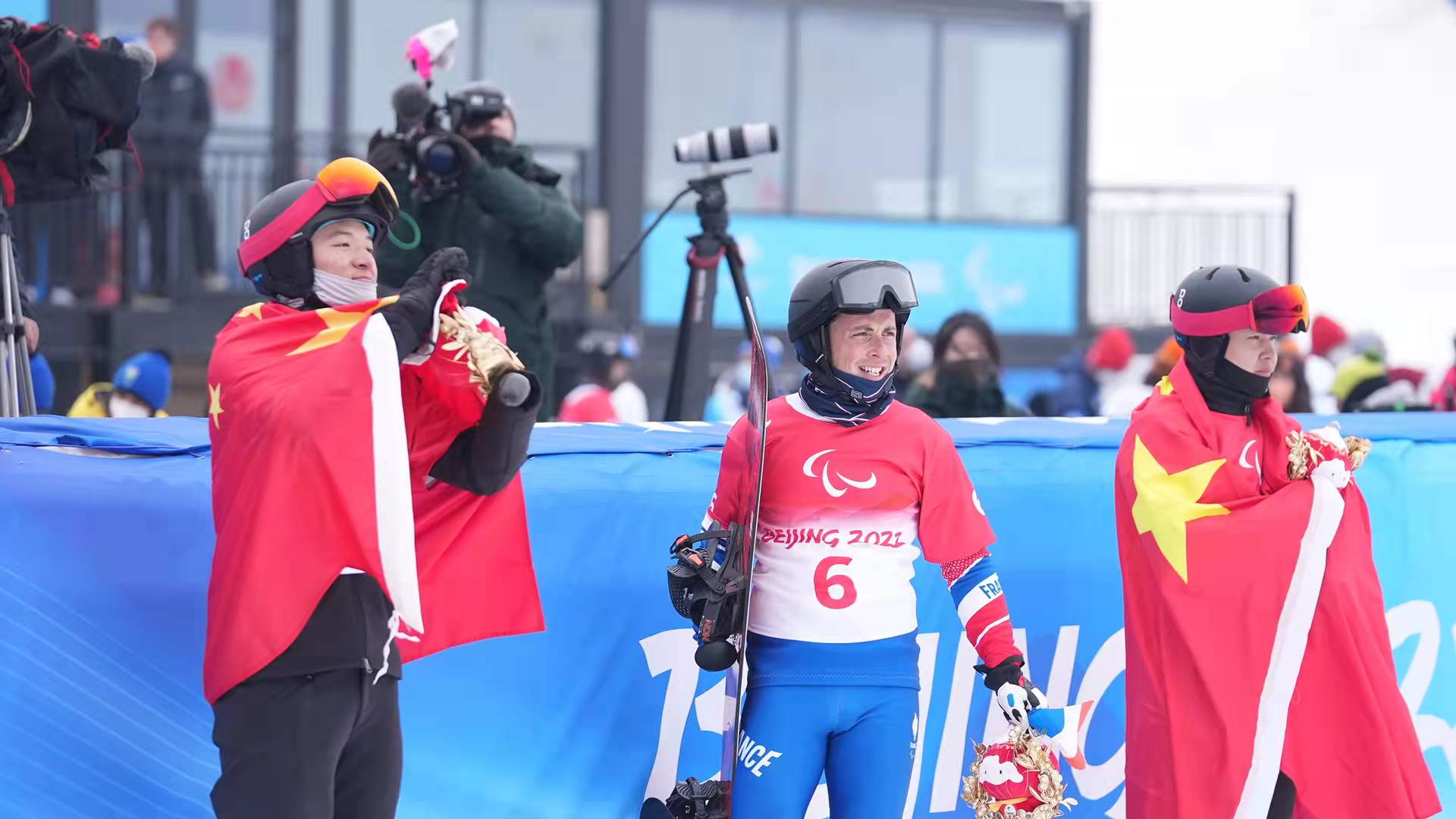 3月11日,在北京冬残奥会残奥单板滑雪男子坡面回转(UL级)比赛中,中国运动员纪立家、朱永钢为中国队再入一银一铜。法国运动员获得金牌。