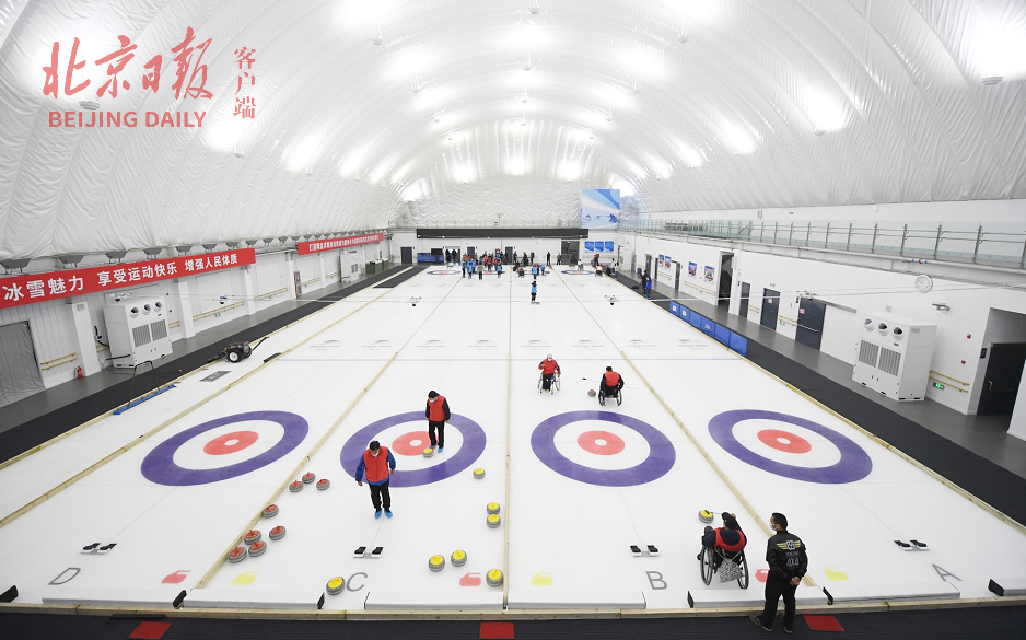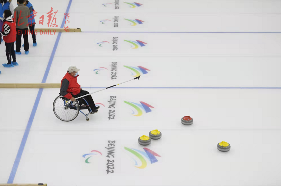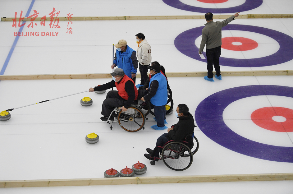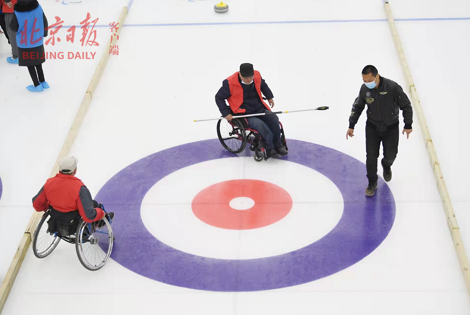 来自东城区残联的残疾人旱地冰壶队受邀在真冰上进行了体验训练。