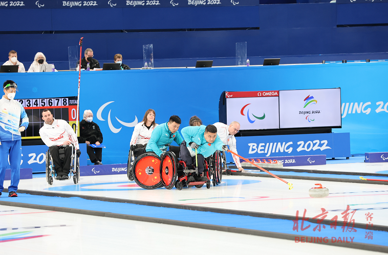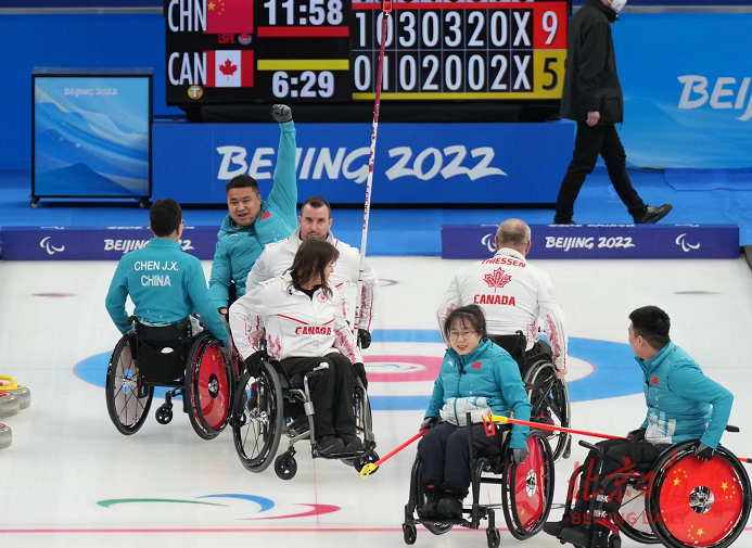 11日下午,两场轮椅冰壶半决赛在冰立方进行,循环赛排第一的中国队对阵第四名加拿大队,斯洛伐克队交手瑞典队,两场比赛胜者将争夺金牌。中国队以9比5击败加拿大队,拿到决赛入场券。