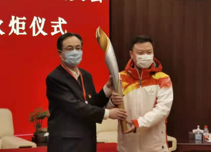 北京冬残奥会火炬手李锐(右)将传递过的北京冬残奥会火炬捐赠给香山革命纪念馆。