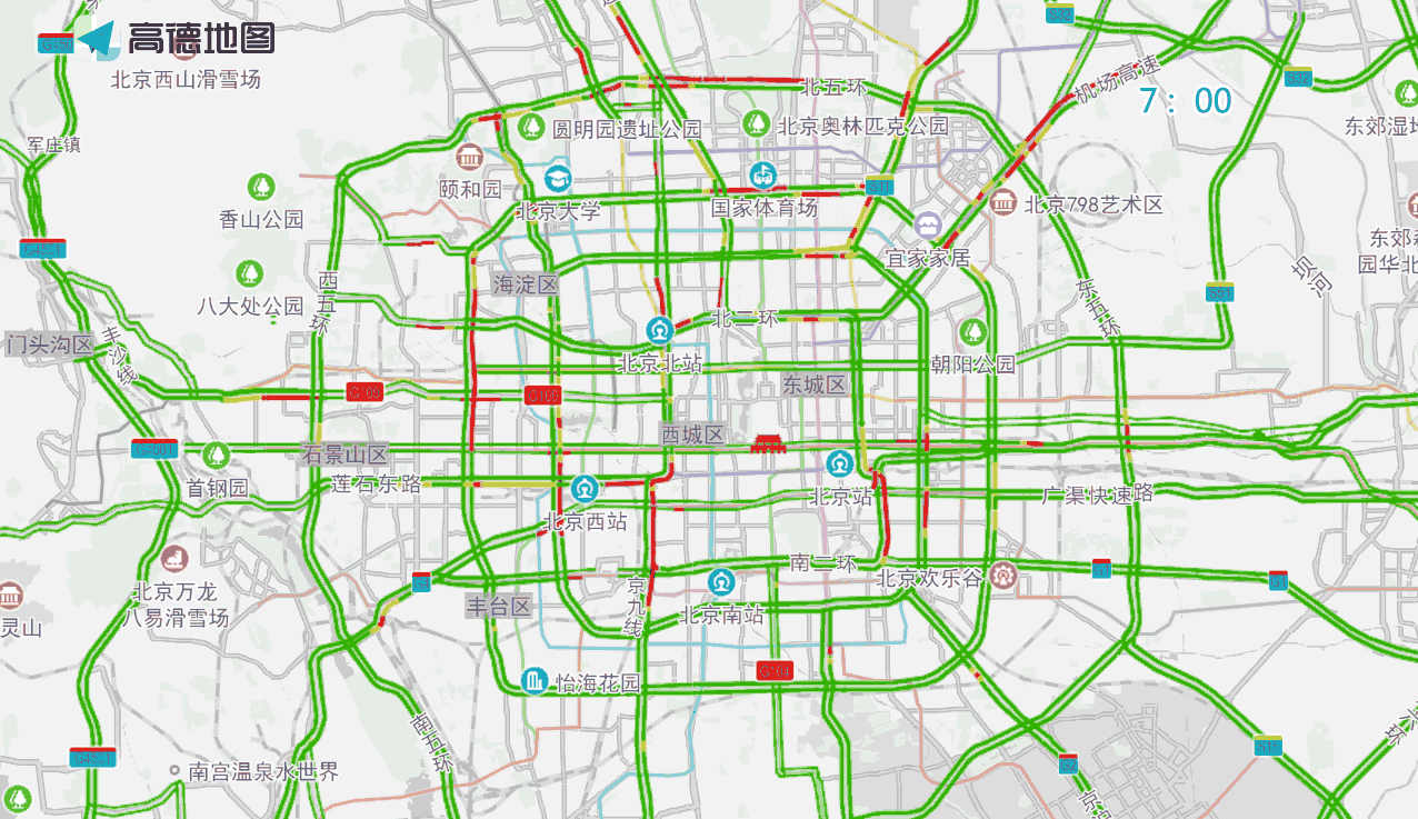 早高峰期间,东部、西部、北部城区环路,菜户营南路、建外大街、通惠河北路、万泉河路、莲石东路、学院路等道路将出现车行缓慢的情况,机场高速、京藏高速、京承高速、京通快速、京港澳高速等将出现进京潮汐车流。部分道路早高峰提前至6:30;8:00—8:30城区通行压力最大。