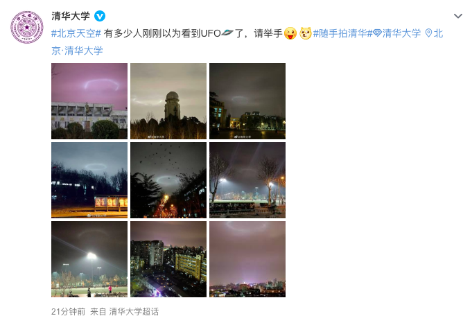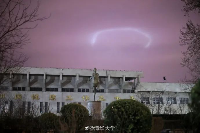 @清华大学 官博也发文表示,在清华校内也可以看见天空的光环。“有多少人刚刚以为看到UFO了,请举手。”